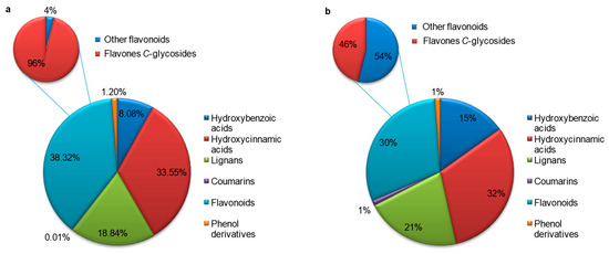 To evaluate the contribution of phenolic compounds, a summary of the characterization results is shown in Figure 4. In the perspective of subclasses, flavonoids were the most abundant, representing 38.3% of the total characterized phenolic metabolites followed by hydroxycinnamic acids and then lignans (Figure 4a). Similarly, flavonoids and hydroxycinnamic acids were also the most representative families in qualitative terms (Figure 4b).
