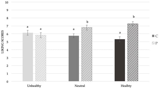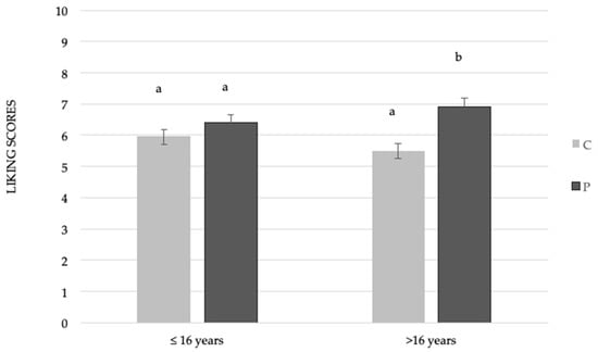 ANOVA results showed a significant effect of the main factor ‘samples’ (F(1,397) = 14.18; p < 0.001) on liking scores. The sample with added P. ostreatus powder (sample P) was significantly preferred (M = 6.6 ± 0.2) by adolescents than the sample without mushroom powder (sample C, M = 5.7 ± 0.1).