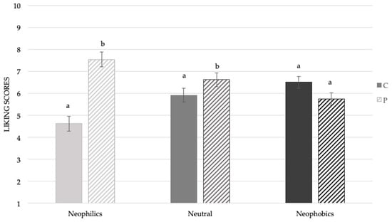 Figure 2, it is possible to observe that the Neophilic subjects gave significantly higher liking scores to the sample added with mushroom powder (M = 7.4 ± 0.4) compared to the control (M = 4.6 ± 0.3). A similar trend was highlighted in the Neutral subjects, even if the differences in hedonic perception were less pronounced compared to the Neophilic group of subjects (M