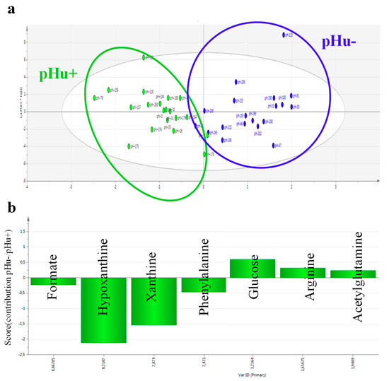 (a) Projection of individuals according to major principal components based on an OPLS-DA (orthogonal projections to latent structures discriminant analysis) model with an explanatory ability (R2Y) of 0.73 and a predictive value (Q²) of 0.64 (the pHu− and pHu + individuals are shown in green and blue, respectively); (b) Contribution of the seven metabolites identified by the OPLS-DA model (pHu−/pHu +). Illustration based on results published in [21].