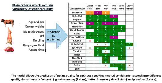 The Australian beef industry and researchers have jointly built, as part of a common and collective strategy, the MSA (Meat Standards Australia) grading scheme, which is a mathematical model for predicting the eating quality of beef for each “muscle × cooking method” combination. This model was constructed from a large database of consumer tests using a standard protocol [99,100]. A dozen parameters with a statistically significant effect on eating quality, such as traits characterizing animals (physiological maturity, weight, genetic type, sex, etc.), pre-slaughter and slaughter conditions (carcass hanging method, etc.), meat (pH, color, marbling, etc.), and post-mortem events (aging time, cooking method, etc.) are considered in the model as well as the interactions between them. Some stakeholders of the beef industry are already using this model, and it appears that its use has contributed to reducing the decline in beef consumption in Australia.