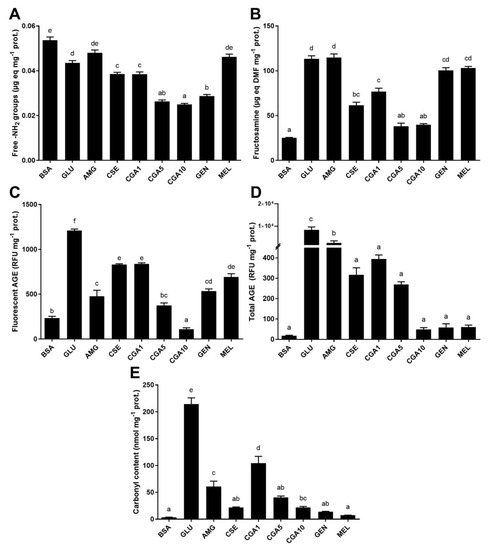 Contents of free amino groups (A), fructosamine (B), fluorescent AGE (C), total AGE (D), and protein oxidation (E) in the samples of the BSA-GLU glycation system (21 days incubation, 37 °C, pH 7.4). BSA: negative control; GLU: BSA + glucose; AMG: BSA + glucose + aminoguanidine; CSE: BSA + glucose + CSE (12,5 mg mL−1); CGA1: BSA + glucose + 1 mmol L−1 CGA; CGA5: BSA + glucose + 5 mmol L−1 CGA; CGA10: BSA + glucose + 10 mmol L−1 CGA; GEN: BSA + glucose + 5 mmol L−1 genistein; MEL: BSA + glucose + 5 mmol L−1 melatonin. Results are presented as mean ± SD (n = 3). Bars with different letters denote significant differences (p < 0.05) when subjected to the Tukey multiple range test.