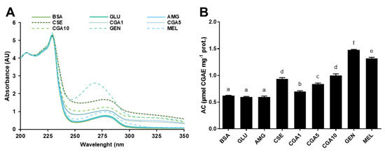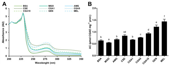 UV-Vis spectra (A) and antioxidant capacities (B) of the high molecular weight protein fractions (>30 kDa) isolated from the samples of the BSA-GLU glycation system (21 days incubation, 37 °C, pH 7.4) BSA: negative control; GLU: BSA + glucose; AMG: BSA + glucose + aminoguanidine; CSE: BSA + glucose + CSE (12,5 mg mL−1); CGA1: BSA + glucose + 1 mmol L−1 CGA; CGA5: BSA + glucose + 5 mmol L−1 CGA; CGA10: BSA + glucose + 10 mmol L−1 CGA; GEN: BSA + glucose + 5 mmol L−1 genistein; MEL: BSA + glucose + 5 mmol L−1 melatonin. Results are presented as mean ± SD (n = 3). Bars with different letters denote significant differences (p < 0.05) when subjected to Tukey multiple range test.