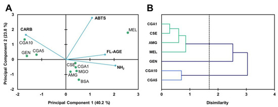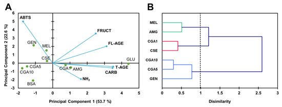 Biplot (scores of samples and load factors of each variable) of the principal component analysis (PCA) (A), including the content of free amino groups (NH2), fructosamine (FRUCT), fluorescent AGE (FL-AGE), total AGE (T-AGE), and protein carbonyls (CARB), and dendrogram of hierarchical cluster analysis of the glycation inhibitory activity (B) of the samples of the BSA-GLU glycation system (21 days agitation, 37 °C, pH 7.4) BSA: negative control; GLU: BSA + glucose; AMG: BSA + glucose + aminoguanidine; CSE: BSA + glucose + CSE (12,5 mg mL−1); CGA1: BSA + glucose + 1 mmol L−1 CGA; CGA5: BSA + glucose + 5 mmol L−1 CGA; CGA10: BSA + glucose + 10 mmol L−1 CGA; GEN: BSA + glucose + 5 mmol L−1 genistein; MEL: BSA + glucose + 5 mmol L−1 melatonin.
