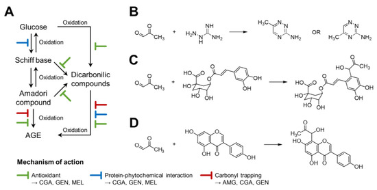 Illustrative diagram of the inhibitory mechanism (A) of coffee silverskin extract and the compounds (aminoguanidine, chlorogenic acid, genistein, and melatonin) studied in this work and the reactions of methylglyoxal trapping by aminoguanidine (B), chlorogenic acid (C), and genistein (D).