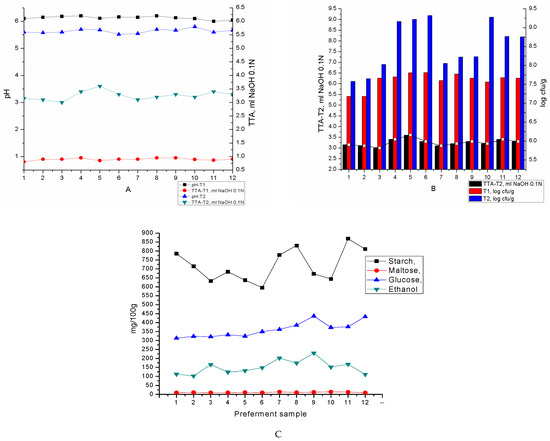 Sugars (starch, maltose/glucose) and ethanol concentrations from the preferment samples were determined enzymatically by using Starch UV colorimetric method (Roche, 748 343; Boehringer Mannheim), maltose/Sucrose/D-glucose UV colorimetric method (Roche, 748 327; Boehringer Mannheim), Ethanol UV colorimetric method (Roche, 668559; Boehringer Mannheim).