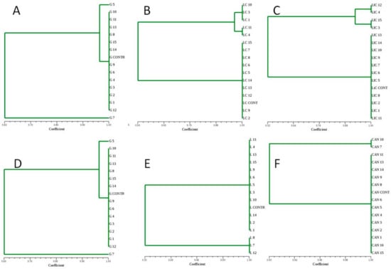 UPGMA dendrograms generated by cluster analysis of inter-δ region patterns obtained from the Saccharomyces cerevisiae strains isolated during the later stages of six different large-scale vinifications obtained from: Primitivo grape must PA1 (A), PA2 (B), and PA3(C) inoculated with the 14093 strain; Negroamaro grape must NA1 (D), NA2 (E), and NA3(F) inoculated with the 14077 strain. The genomic DNA extracted from a pure culture of the 14093 and 14077 strains have been used as a control (CONTR).