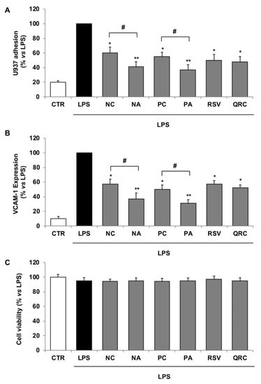Effects of wine polyphenolic extracts or pure polyphenols on endothelial–monocyte adhesion and VCAM-1 expression. HMEC-1 were incubated with blend polyphenolic extracts (NC, PC, NA, PA) (10 µL), pure polyphenols (resveratrol, RSV; quercetin, QRC) (10 µmol/L), or vehicle (control, CTR) for 1 h and then stimulated with LPS 0.5 μg/mL for 16 h. (A): HMEC-1 were co-cultured with calcein AM-labeled U937 monocytes. Fluorescence plate reader measured the number of adherent U937 cells. The values of monocyte adhesion are represented in comparison to monocyte adhesion to LPS-stimulated HMEC-1, normalized at 100%. (B): Cell surface expression of VCAM-1 was analyzed by cell surface enzyme immune assay (EIA). (C): Endothelial cell viability by MTT assay. Each experiment was performed in triplicate. Data are expressed as the percentage of LPS (mean ± S.D.). * p < 0.05; ** p < 0.01 vs. LPS alone; # p < 0.05 NA vs. NC or PA vs. PC.