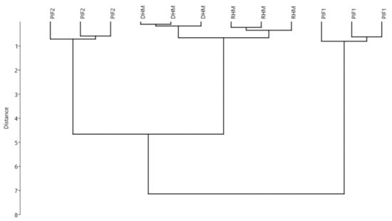 Multivariate cluster analysis (UPGMA algorithm – Manhattan distance) of different preterm infant formula milks (per 100 mL product). Variables (n = 3): antioxidant capacities (measured as TEAC and DPPH), protein carbonyl and malondialdehyde contents. RHM: raw human milk; DHM: holder pasteurized human milk; PIF1: preterm infant formula type 1; PIF2: preterm infant formula type 2.