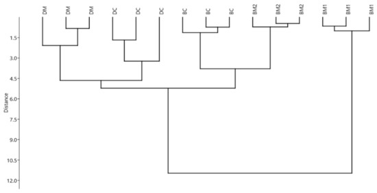 Multivariate cluster analysis (UPGMA algorithm – Manhattan distance) of different human milk fortifiers and protein concentrate (per g of added protein). Variables (n = 3): antioxidant capacities (measured as TEAC, DPPH, and CAA (Cellular antioxidant activity)), haemolysis, protein carbonyl and malondialdehyde contents. BM1: bovine milk preterm fortifier type 1; BM2: bovine milk preterm fortifier type 2; DM: donkey milk preterm fortifier; DC: donkey milk preterm concentrate; BC: bovine milk concentrate.