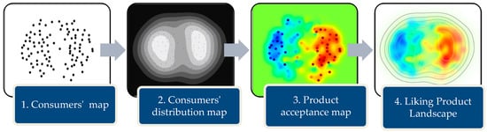 The objective of this manuscript is to propose a visualization method, called liking product landscape (LPL), which is capable of identifying consumers’ segments and consumers’ preferences, recognizing the perception of product attributes and identifying that attributes that need to be optimized. It helps to make decisions when a new product is being launched into the market, to compare products and to analyze whether a product needs to be reformulated. It is based on consumers’ evaluations using a hedonic scale for overall liking and a JAR scale for attributes. Consumers are positioned in a multidimensional space and several techniques for mapping that space to a plane are tested, such as principal component analysis and multidimensional scaling. The consumers’ distribution is represented, as landscape segmentation analysis [40,41,42], to identify consumers’ segments. Besides, the consumers’ evaluations are superimposed with a regression model, similar to Danzart’s proposal [33,34]. We created several maps, one for each evaluation, as consumers’ preference analysis (CPA) [37], intending to reduce the noise when averaging grades. Support vector machines were used for calculating the regression model and then compared with the original model proposed by Danzart. The difference between LPL and CPA is that CPA only uses different colors when plotting the points, whereas LPL uses a regression model; in addition, it incorporates a consumers’ distribution map. Besides, as penalty analysis, LPL allows analyzing whether consumers who do not find a particular attribute JAR rate the product lower on the overall liking than those who find the same attribute JAR. However, in LPL we use a visualization technique. Moreover, we released our LPL Python implementation as open-source [47].