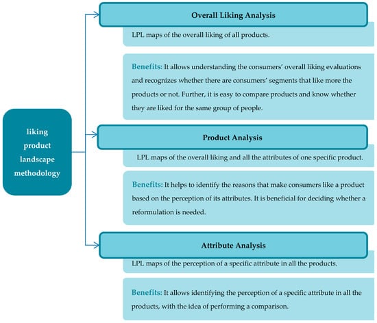 Three analyses can be successfully performed. The first one is overall liking analysis, with the LPL maps of the overall liking of all products. It represents the overall liking in detail for each product allowing to recognize whether there are consumers’ segments which like the products more or not. LPL facilitates the comparison among products and it is easy to know whether they are liked for the same group of people. The second is product analysis, where the LPL maps present the overall liking and all the attributes of one specific product. This analysis helps to identify the characteristics that make a product likeable based on the perception of its attributes. It is beneficial for deciding whether a reformulation is needed. Finally, attribute analysis allows identifying the perception of a specific attribute in all the products, with the idea of performing a comparison. All LPL maps include the consumers’ distribution that helps to understand dense zones of consumers. LPL is a methodology that allows visualizing the information, not only of the overall liking but also the attributes, making it an approachable and straightforward approach to identify consumers’ perceptions by consumers’ segments.