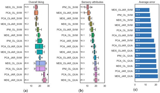 Comparison among all techniques and data that can be applied for constructing liking product landscape (LPL) maps considering the percentage error. (a) LPL maps’ percentage errors that represent overall liking evaluations, (b) LPL maps’ percentage errors that represent just-about-right (JAR) evaluations and (c) average errors of both evaluations. For improving the reading, the techniques are sorted based on their average percentage error, which is also shown in the figure. MDS, Multidimensional scaling; OL, overall liking; SVM, support vector machines; PCA, principal component analysis; JAR, just-about-right; IPM, Internal preference mapping; QUA, Quadratic Model.