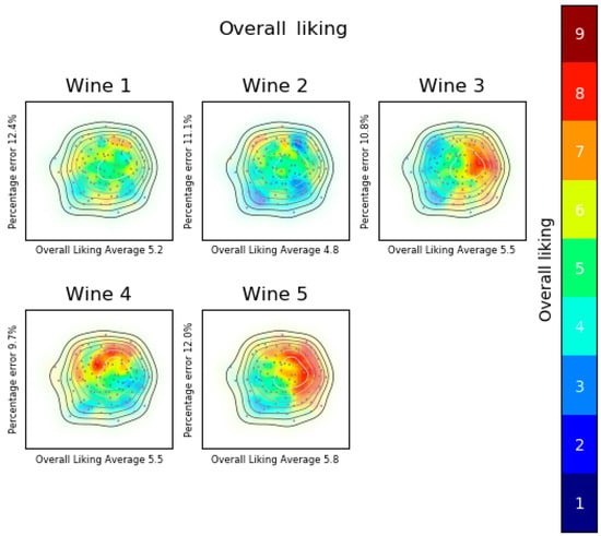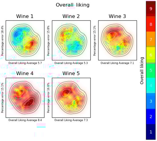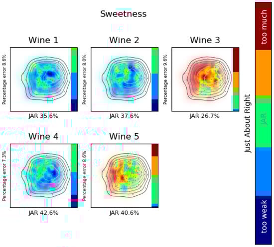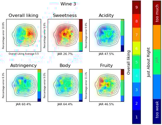 To simplify the reading, some key colors are used. In the liking product landscape maps where the overall liking is analyzed (Figures 5, 8 and 9) red zones represent consumers who evaluated the product higher, whereas blue areas represent consumers that graded it lower. For attribute perception (Figures 9 and 10) green indicates that the attribute is JAR, yellow represents that it has more and red too much of the attribute. In contrast, blue represents a little less and dark blue too weak intensity of the attribute. A bar was added whose parts are of proportional length to the percentage of consumers that affirm that the product has a specific JAR value. Areas without consumers are plotted totally in white; in contrast, areas with brilliant colors represent dense consumers’ zones; moreover, a contour plot is used to represent the density of consumers. Some numeric values are printed, as the percentage error of the product acceptance map, the average overall liking or the JAR percentage.