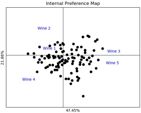 Preference mapping is of use primarily in research and food development. It can establish: (1) The most liked products, (2) patterns of consumer liking through segmentation based on demographic and socio-cultural differences, (3) reasons for liking and rejecting products and (4) the drivers of liking. Preference mapping can give a clear idea of what changes must be made in product reformulation [20,21,22,23,24]. Preference mapping is divided into two categories: Internal preference mapping (IPM) and external preference mapping (EPM). IPM and EPM are complementary. The first one is useful for understanding the dominant products based on the analysis of consumers’ overall liking [25]. The latter allows the comparison of products based on their attributes or physicochemical characteristics [26].