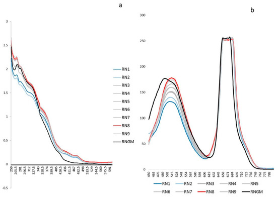 Untargeted spectroscopic fingerprints of the R. nigrum bud (RNB) phytocomplex: (a) The UV-Vis averaged spectra (250–600 nm) of the nine experiments selected by the DoE and the corresponding R. nigrum glyceric macerate (RNGM) tested at the same dilution (1:20 in the extraction solvent); (b) The 2D Fluorescence averaged spectral emissions (450–800 nm) of the nine experiments selected by the DoE and the corresponding RNGM tested at the same dilution (1:20 in the extraction solvent).