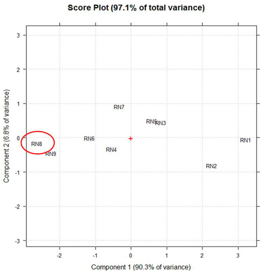 The score plot on the first two principle components (PCs) selected by principle component analysis (PCA) using the vector of UV-Vis (250–600 nm) spectra coupled to fluorescence (450–800 nm) absorptions of each extract (RN1–RN9) as a multivariate untargeted signal. The red + represents the central point of the plot and the red circle highlights the extract obtained in the best experimental conditions.