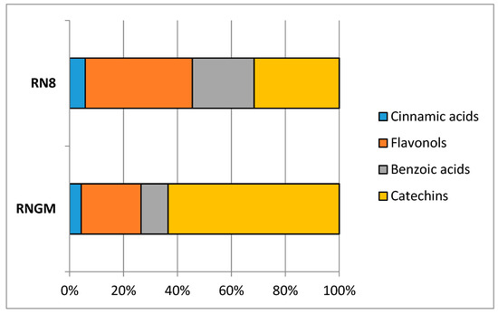 Contribution of each polyphenolic class to the total phytocomplex in RN8 and RNGM analyzed samples.