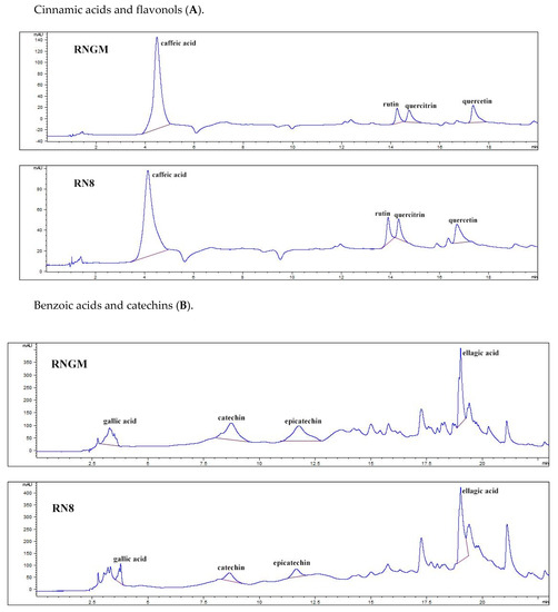 Chromatographic pattern of polyphenolic compounds identified in RN8 and RNGM samples: (A) Cinnamic acids and flavonols; (B) Benzoic acids and catechins. In the chromatograms, the x-axis represents the signal current intensity (mAU), while the y-axis represents time (min).