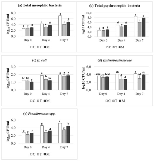 Effect of dietary treatment (Control (C), Tara (T) or Mimosa (M)) and time of storage (days 0, 4 and 7) on microbial counts expressed as log10 CFU/mL: (a) total mesophilic bacteria; (b) total psychrotrophic bacteria; (c) E. coli; (d) Enterobacteriaceae; (e) Pseudomonas spp. a–g: Values with different superscripts are significantly different (p ≤ 0.05).