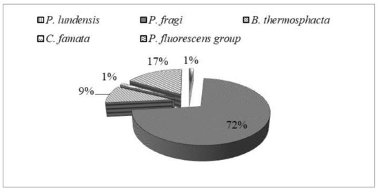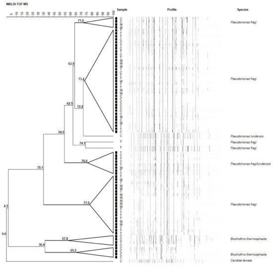 Seventy-nine randomly selected isolates were subsequently subjected to MALDI-TOF MS analysis for identification at species level. Results are illustrated in Figure 2. Overall, among isolates, 57 (72%) strains were ascribed to P. fragi, 7 (9%) to Brochothrix thermosphacta, 1 (1%) to Pseudomonas lundensis, and 1 (1%) to Candida famata (Figure 3). The remaining 13 (17%) strains were ascribed to the members of Pseudomonas fluorescens group, representing the most found group in T and M samples. They will be subjected to sequencing of the 16S rDNA in order to confirm their affiliation.