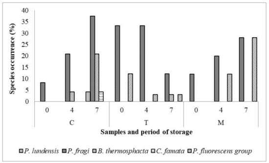 Zooming in to the prevalence of spoilage bacteria in M, T, and C samples, as represented in Figure 4, the P. fragi was the most abundant species in all samples, followed by B. thermosphacta, C. famata and P. lundensis. Only in T samples was a significant reduction of spoilage bacteria revealed during storage. On the contrary, a qualitative and quantitative increase of spoilage bacteria was observed in C samples at 7 days of refrigerated storage; indeed, P. lundensis and C. famata species were detected only in C samples.