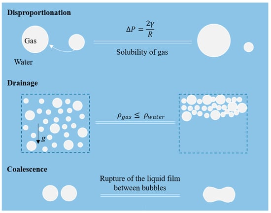 Foam is a colloidal system consisting of a high-volume fraction of gas phase and a liquid (or solid) phase. It is made by mixing or injecting gas bubbles into the liquid (that later may be solidified). Emulsifiers, if any, in the foaming system are used for stabilizing the newly created gas-water interface by decreasing the surface tension (γ), and modifying the interfacial viscoelasticity as well as the repulsive interaction forces between bubbles. However, foams are thermodynamically unstable. The principles of stability have extensively been described by Walstra (1989) [1]. The main destabilization mechanisms of foam are disproportionation (also termed Oswald ripening), drainage, and coalescence, and are illustrated in Figure 1. These mechanisms occur simultaneously, and act synergistically. Disproportionation is the most predominant and fast process. It is a result of the pressure difference between bubbles, due to the Laplace pressure ∆P = in each bubble. Since the gas in the small bubbles (small radius R) has a higher pressure than that in large bubbles, it tends to diffuse through the liquid phase towards large bubbles. The average bubble size increases with time, with large bubbles growing at the expense of small ones. As a result, polydisperse foams are more prone to coarsening and subsequent destabilization. Disproportionation is especially pronounced in foams due to the high solubility of gas in water—in contrast, the effect is much smaller for emulsions, which consist of liquid droplets dispersed in another immiscible liquid phase (the solubility of e.g., triglyceride is very low in water). During foam drainage, water leaks out of the foam due to gravity (g: Acceleration) based on the large density difference between gas phase () and water phase (), and the bubbles rise. Their rising velocity scales with R2, demonstrating the enhancement of drainage by disproportionation. Furthermore, due to the drainage process, the liquid film between bubbles becomes thinner, which initiates coalescence of bubbles.