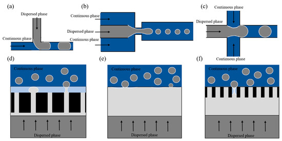 Various microfluidic devices have been introduced for the formation of monodisperse foams, and they use either a shear force, or spontaneous snap-off for bubble formation. The typical shear-based geometries include T-junction (Figure 2a) [13,14,15,16], flow-focusing (Figure 2b) [17,18,19,20,21], and co-flowing devices (Figure 2c) [22]. On the other hand, devices that use spontaneous snap-off are microchannels (e.g., terrace-based microchannel, which is a so-called 2.5D geometry; Figure 2d) [23,24] and Edge-based Droplet GEneration (EDGE; Figure 2e, also termed STEP) devices [25].