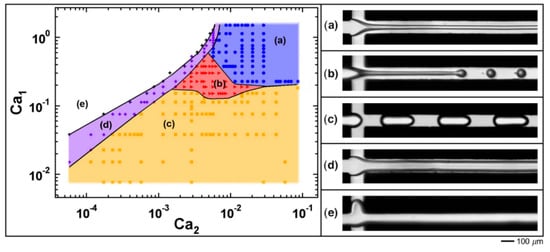 Capillary number-based flow patterns in a flow-focusing microchannel. Ca1 and Ca2 are the capillary numbers of the to-be-dispersed and continuous phases, respectively. The five flow patterns are: (a) Threading; (b) jetting; (c) dripping; (d) tubing; (e) and viscous displacement. Reprinted from Cubaud et al. (2008) [31], with the permission of AIP publishing.