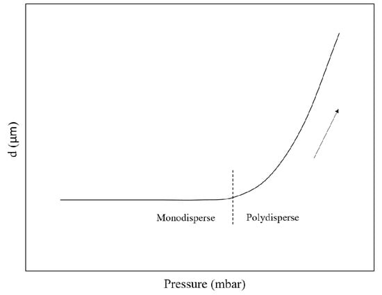Spontaneous droplet formation is not significantly influenced by the continuous phase flow, in contrast to the shear-based droplet formation discussed above [36]. In a grooved MC system (see Figure 2d), Yasuno et al. (2004) [23] obtained foams with bubble size ranging from 33.6 to 51.1 µm and a coefficient of variation (CV) below 10%, and found that the bubble size was influenced by the continuous phase viscosity, yet independent of surface tension. Stoffel et al. (2012) [24] reported a two-stage bubble formation mechanism: The pressurized gas flows through a channel onto a shallow wide terrace, and then overflows into a deep channel (in which the continuous phase flow is present to carry away the generated bubbles). The radius of the curvature on the terrace gradually decreases, and when the critical radius is achieved a rapid pinch-off follows and a bubble is formed. The bubble size remains constant with increasing gas pressure in the so-called monodisperse regime, while as soon as the gas pressure exceeds a certain threshold (see Figure 4), the size distribution becomes polydisperse. This transition to polydispersity has also extensively been reported for emulsions, and has been defined by a critical capillary number (of the to-be-dispersed phase), which indicates that the viscous force becomes dominant over surface tension force [37].