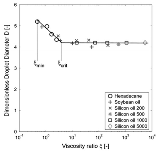 Plot of the dimensionless droplet diameter as a function of the viscosity ratio in terrace-based microchannels forming an oil-in-water emulsion. The viscosity of both phases is varied. Reprinted from van Dijke et al. (2010) [38].
