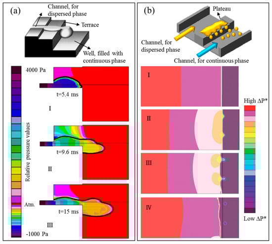 In (a), top: A forming droplet in the terrace-based MC system, adapted from Sugiura et al. (2002) [37] with permission from American Chemical Society; bottom: Half of the geometry of the MC system modeled to investigate the pressure gradient around the forming droplet at different time stages (I, II, and III) during emulsification, adapted from van Dijke et al. (2010) [38]. In (b), top: Droplet formation in an EDGE system, adapted from Sahin et al. (2016) [43]; bottom: Droplet formation on the plateau modeled from continuous phase filling the plateau, till the droplets are detached (I through IV), used to investigate the pressure gradient around forming droplets (light blue); adapted from van Dijke et al. (2010) [44] with permission from The Royal Society of Chemistry. In both systems, the pressure gradient near the droplet formation site becomes steeper with growing droplet size.