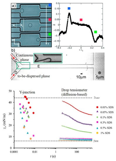 - Steegmans, M.L.J.; Warmerdam, A.; Schroen, K.G.P.H.; Boom, R.M. Dynamic interfacial tension measurements with microfluidic Y-junctions. Langmuir 2009, 25, 9751–9758. [Google Scholar] [CrossRef] [PubMed]