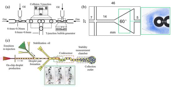 (a) Microfluidic system for 1-on-1 bubble interaction, reprinted from Yang et al. (2009) [66]. (b) Microfluidic expansion device and the velocity field (obtained by the micro Particle Image Velocimetry technique, micro-PIV) around the aligned bubbles, reprinted and adapted from Fu et al. (2015) [67] with permission from Elsevier. (c) Droplet fusion device, consisting of a droplet generation junction, a coalescence channel and a detection unit, for the assessment of coalescence stability; reproduced and adapted from Mazutis et al. (2012) [68] by permission from the Royal Society of Chemistry.