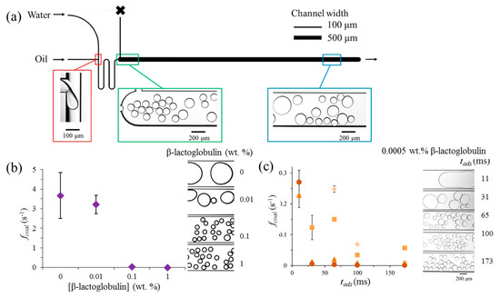 (a) Coalescence chamber, including a T-junction (red rectangle), a meandering adsorption channel, and a coalescence channel; reprinted from Muijlwijk et al. (2017) [11], with permission from Elsevier. (b) The coalescence frequency of bubbles as a function of protein concentration, at 100 ms adsorption time; reproduced from Muijlwijk (2017) [72]. (c) The coalescence frequency of droplets as function of adsorption time (achieved by varying the length of the meandering channel) and wt. % β-lactoglobulin (0.005, 0.001, 0.05, and 0.01, darker symbols correspond to higher concentrations); reprinted from Muijlwijk et al. (2017) [11], with permission from Elsevier.