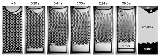 A deeper understanding of the ageing mechanisms and the corresponding critical conditions are relevant for effective control over bubble destabilization, and it is expected that microfluidics can make a contribution to this. The so-called micro centrifuge has been used for emulsion stability testing at high g-force (see Figure 10) [76]. An emulsion is first created in a separate microfluidic device and transferred into a small container-like microfluidic chip that is mounted onto a rotating device. The chip is spun in front of a carefully synchronized high-speed camera. From the obtained images, the size of the droplets, their deformation, and also coalescence behavior could be derived. Under enhanced g-force condition the (highly stable) droplets do deform greatly to a honeycomb structure, yet they do not coalesce (see Figure 10). For less stable emulsions, extensive coalescence was observed that could even be related to the critical disjoining pressure [77].