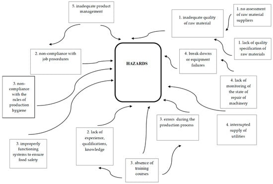The relationship diagram below illustrates the causes of hazards (Figure 1). Five main causes were identified in the studied plants, which can be classified as follows: 1. materials, 2. people, 3. methods, 4. machines, and 5. management. This diagram not only defines the cause-effect relationships, but also the cause-cause relationships. For example, inadequate product management may be caused by insufficient qualifications, education, experience, and the lack of staff training. Inadequate product management may cause non-compliance with job procedures.
