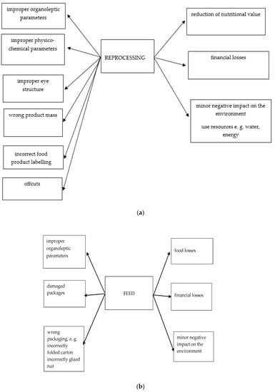 Products that could not be reprocessed (e.g., due to contamination caused by damage to packaging) or products with incorrect organoleptic characteristics were used to produce feed (Figure 2b). The incidence of all hazards resulting in hand over for feed was 2. As Garrone et al. [50] noted, animal feed is often an appropriate alternative strategy; not only does it make it possible to avoid the cost of disposal, but it may produce revenue, although less than in the case of the sale of surplus food that was intended for human consumption. The positive impact of the hand over of surplus food to animal feed also has a positive impact on the environment due to saving resources (e.g., water, energy).