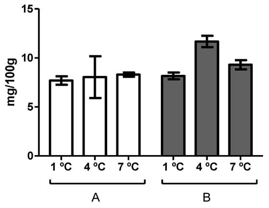 On the other hand, Figure 1 shows the trimethylamine (TMA) values determined at the day of spoilage of the hake fillets stored at different temperatures, as determined by sensory analysis. As can be observed, these values were higher than 5 mg-N TMA 100 g−1—which is the limit of acceptability proposed by Baixas-Nogueiras et al. [26] for hake—for all the samples. It should be noted that the time of spoilage determined via sensory analysis was coincident with the day on which samples surpassed the threshold limit indicated above for batch A, but not for batch B, for which it was surpassed 1–2 days before (data not shown).