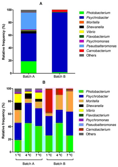 On the other hand, as can be observed in Figure 2B, Photobacterium and Psychrobacter are the dominant genera in hake fillets at the time of spoilage in all analyzed samples but one (Batch B; storage temperature 1 °C). Photobacterium represented between 19% and 46% and Psychrobacter between 27% and 38% of all microbiota. They were followed by Moritella, Carnobacterium, Shewanella, and Vibrio, whose relative order varied depending on the sample/batch analyzed. The relative amount of Moritella was high in all samples (ranging from 4.3% to 32.2%) and was the third most abundant microorganism in four out of six samples. However, the amounts of Shewanella, Vibrio, and Carnobacterium were very different depending on the batch and the sample analyzed. Thus, Shewanella was much more abundant in spoiled hake samples of the first batch than in those of the second one (7.92% versus 0.30%). Similar results were obtained for Vibrio. Conversely, Carnobacterium was much more abundant in the spoiled samples of the second batch (0.18% versus 16.4%). Regarding this latter microorganism, considerable differences were also found among samples coming from Batch B depending on temperature: The relative abundance of this microorganism was higher in spoiled samples the lower the temperature assayed.