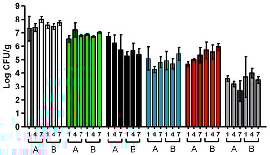 Microbial counts (Log CFU/g) at the time of spoilage of hake fillets stored in MAP of the two batches studied (A and B) and at each of the temperatures investigated (1, 4, and 7 °C). Anaerobic psychrotrophs (white bars), Photobacterium (green bars), Shewanella (black bars), Pseudomonas (blue bars), Lactic acid bacteria (red bars) and Enterobacteriaceae (grey bars). Error bars represent the standard deviation.