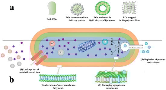 (a) Bulk EOs and different types of EO delivery systems, including nanoemulsion, liposomes, and biopolymer films; (b) Proposed common mechanisms of action and target sites of essential oils (EOs) or EO delivery systems on bacterial cell [110].