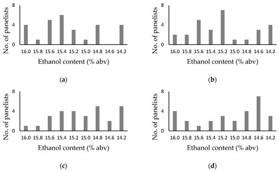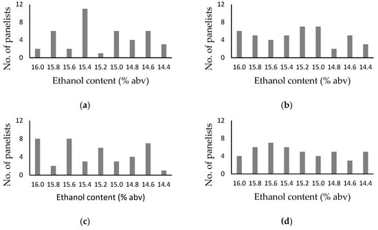 Histograms showing sample preferences from alcohol sweetspotting trials (performed in duplicate, with an expert panel of 14 winemakers) with samples comprising wine A, RAW A and blends thereof, spanning ethanol levels from 14.4 to 16.0% abv, using: (a) row, randomized, (b) row, ordered, (c) circular, randomized and (d) circular ordered, presentation formats.
