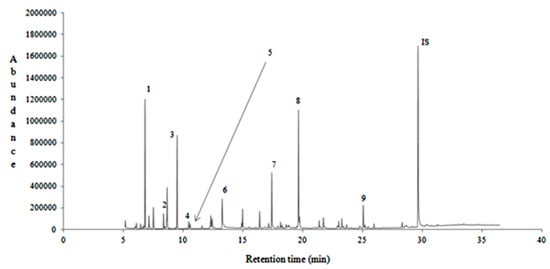 A typical gas chromatogram of clover honey (no. 3) from Egypt indicating selected key volatile compounds. 1: 2-methyl-Butanal. 2: 3-methyl-Butanal. 3: Heptane. 4: 3-methyl-1-Butanol. 5: 2-methyl-1-Butanol. 6: Furfural. 7: Octanal. 8: Nonanal. 9: Decanoic acid ethyl ester. IS: Internal standard.