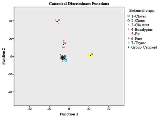 The overall classification rate was 77.3% for the training and 87.8% for the holdout sample and was satisfactory in both cases. The botanical origin classification rate of honey types for the training sample followed the sequence: clover (75%), citrus (70.8%), chestnut (0%), eucalyptus (0%), fir (95.8%), pine (92.3%), and thyme (58.3%). However, the zero classification rates of chestnut and eucalyptus honeys are attributed to the limited honey samples, since the majority of them were assigned to the holdout sample. Of the eight clover honey samples subjected to training analysis, six were assigned to clover and two to thyme honeys. Similarly, of the 24 citrus honey samples, 17 samples were assigned to citrus, one to clover, four to pine, and two to thyme honeys, respectively. One chestnut honey sample was assigned to eucalyptus honeys. Of the 24 fir honey samples, 23 were assigned to fir and only one to pine honeys. A similar trend was obtained for pine honeys—in which, 25 samples were assigned to pine and only one to fir honeys, respectively. Finally, of the 24 thyme honey samples, 14 were assigned to thyme, six to pine, three to clover, and one to citrus honeys, respectively.