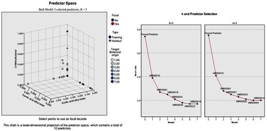 The model was built with k = 3, k = 4, and k = 5 nearest neighbors, which were automatically selected. Similar to the botanical origin differentiation of honeys, the forced predictors’ error was considered for the selection of the best model. The 10 predictors that were obtained during the k-NN analysis with k = 3 neighbors were the three forced predictors (heptane, formic acid ethyl ester, acetic acid ethyl ester) followed by dodecanoic acid ethyl ester, benzaldehyde, nonanal, alpha-terpinene, geranyl acetone, 5-methyl-4-nonene, and lilac aldehyde B (isomer II). The total error rate of the three specified features was 0.6818. The respective individual error rate for the seven aforementioned predictors was: 0.30, 0.2727, 0.2455, 0.1818, 0.1616, 0.1455, 0.1364, and 0.1364.
