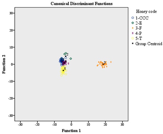 In Figure 4, the differentiation of the 151 honey samples according to the honey code is shown. The group centroid values are as follows: (−4.968, −1.828), (−2.691, −4.647), (16.454, −0.115), (−4.012, −0.914), (−3.834, 3.844) for honeys encoded with CCC, E, F, P, and T, respectively.