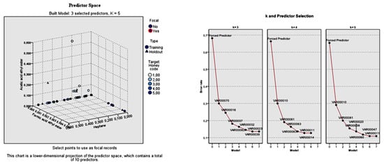 Finally, the total error rate of the model built with k = 5 nearest neighbors in relation to the three specified features was 0.6545. The individual error rate for the seven predictors left was: 0.2909, 0.20, 0.1364, 0.1545, 0.1182, 0.1091, and 0.1091, for furfural, lilac aldehyde C (isomer III), benzeneacetaldehyde, octanoic acid ethyl ester, nonanoic acid ethyl ester, nonanoic acid, and pentanoic acid. The selection of the predictors during k-NN analysis with k = 3, k = 4, and k = 5 nearest neighbors according to the honey code is shown in Figure 5.