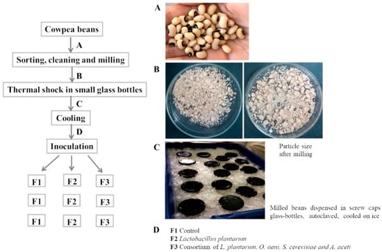 Cowpea beans were purchased from a local supermarket and were sorted, cleaned of impurities and selected the largest and entire beans and then ground to pass 2 mm sieve (Retsch, cutting mill, model SM1, 42781 Haan, Germany), to obtain a granular product with small particle size and greater surface area that microbiota can interact with and thus increase its fermentability. Ground beans (70 g) were dispensed into small screw caps glass-flasks which were autoclaved, for 10 min at 65 °C or 100 °C (60L- stainless steel steam autoclave, Orion B6, GA, USA). Major steps of flours fermentation process are displayed in Figure 1. Immediately after the thermal shock, the flasks were cooled on ice (about 15 min) and 125 μL of 6% sulphur dioxide solution/100 g of seeds was added to each flask under aseptic conditions. Three levels of moisture (10, 20 and 30%) were investigated in the four set of biological independent experiments. In the first set, ground beans were soaked under aseptic conditions with sterile saline solution to obtain 10% of humidity and fermentation was conducted during 72 h. In the next set of experiments, fermentation length was extended to 96 h and moisture content increased to 20% with sterile saline solution. In the 3rd and 4th set of experiments, ground beans were soaked with saline solution to obtain 30% of humidity and fermentation length was maintained for 96 h. The 3rd set of experiments differs from the 4th because thermal shocks were conducted at different temperatures, at 65 or 100 °C for 10 min, respectively. Immediately after the thermal shock, the flasks were cooled on ice (about 15 min) and 125 μL of 6% sulphur dioxide solution/100 g of seeds was added to each flask under aseptic conditions. The same inoculation procedure was used in all experiments.