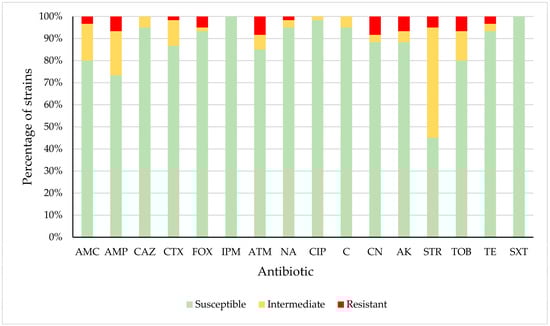 Percentage of Escherichia coli strains susceptible, intermediate or resistant to each antibiotic tested. Amoxicillin-clavulanic acid (AMC); ampicillin (AMP); ceftazidime (CAZ); cefotaxime (CTX); cefoxitin (FOX); imipenem (IPM); aztreonam (ATM); nalidixic acid (NA); ciprofloxacin (CIP); chloramphenicol (C); gentamicin (CN); amikacin (AK); streptomycin (STR); tobramycin (TOB); tetracycline (TE); trimethoprim-sulfamethoxazole (SXT).